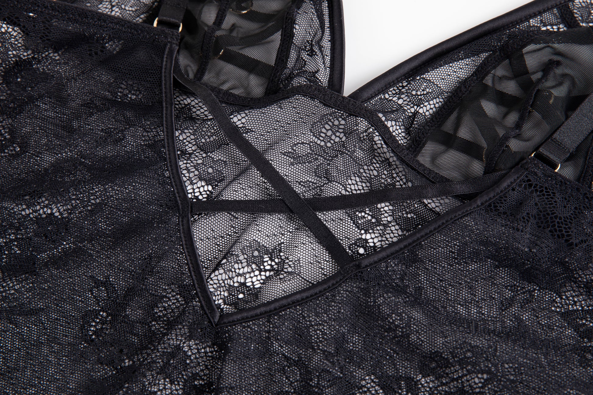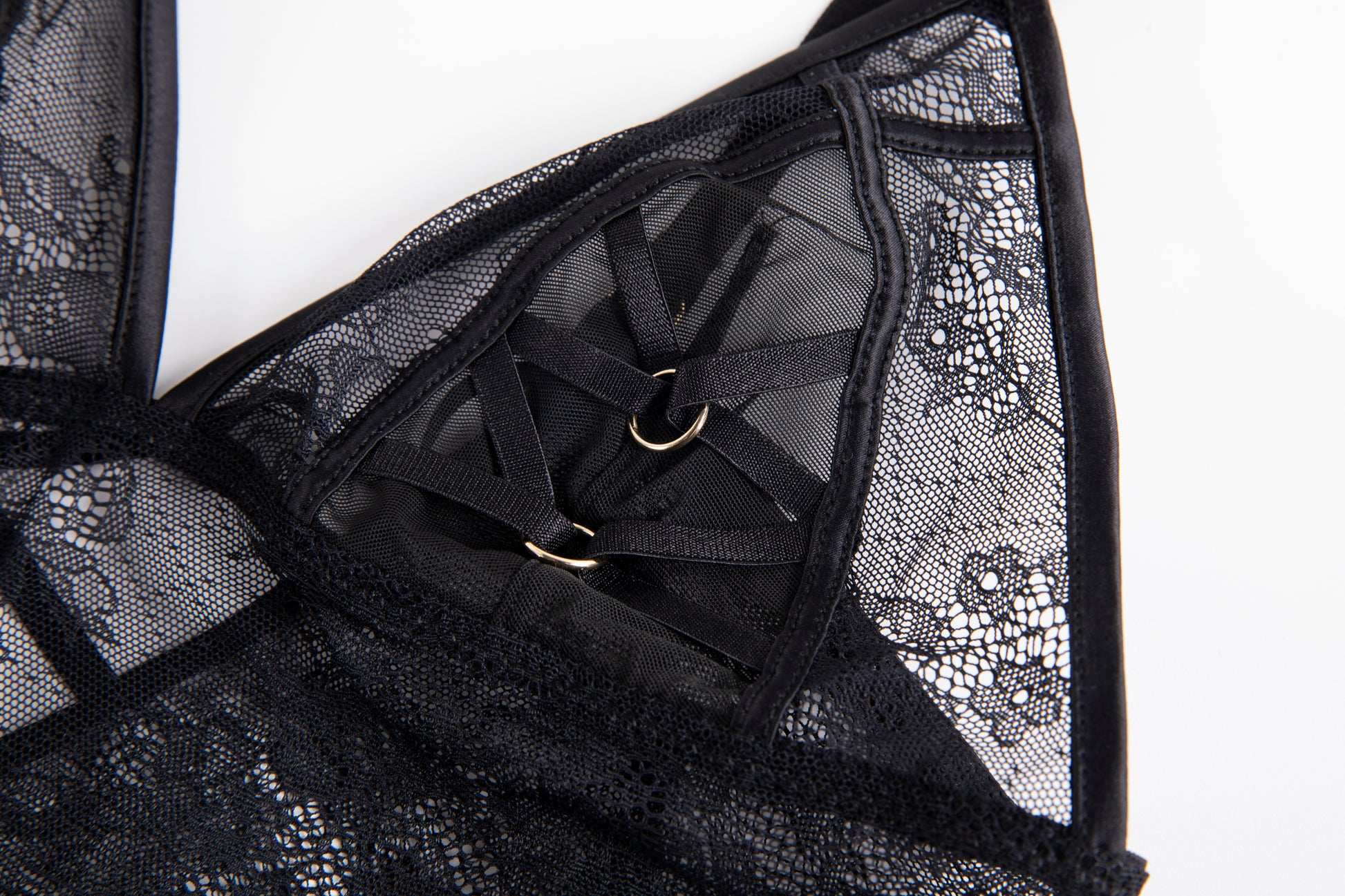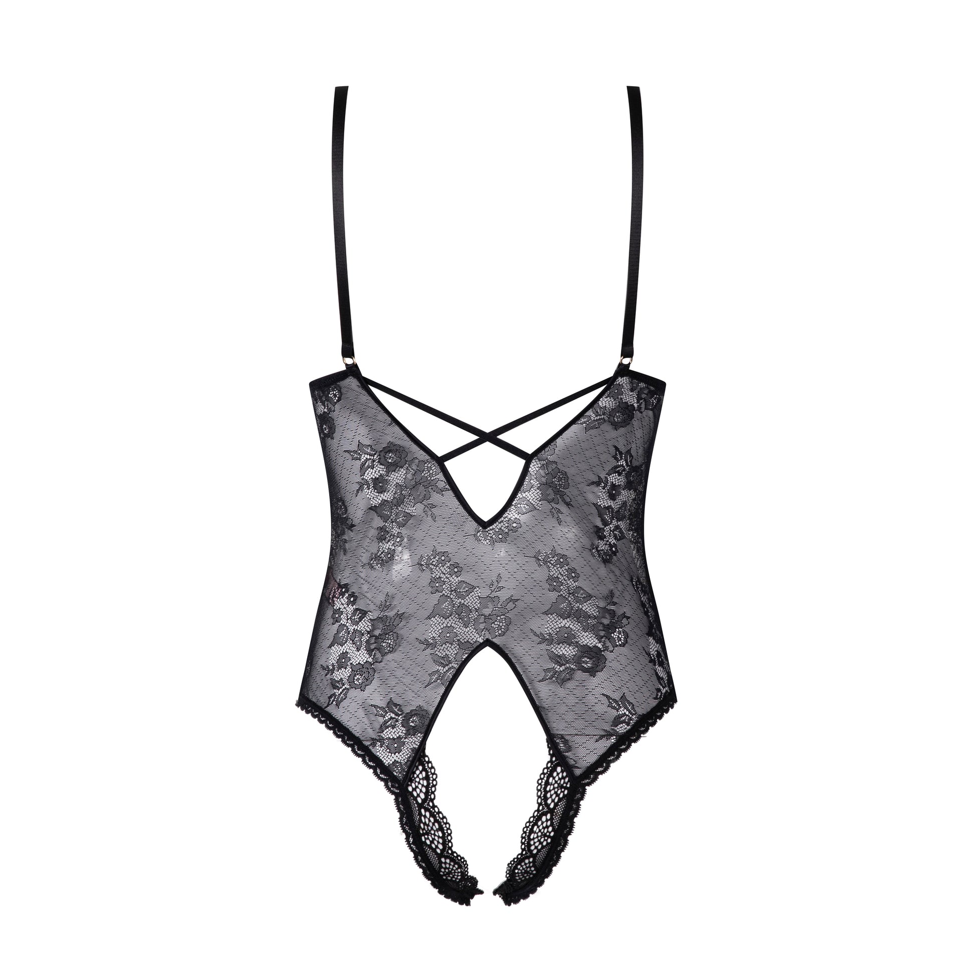 A celestial blend of seduction and elegance, this open-crotch bodysuit is crafted from delicate floral lace that flatters and reveals in equal measure. Soft triangle cups are framed by bold strappy detailing and gold-tone accents, while adjustable straps ensure a flawless fit. The open back is finished with fine, intersecting straps. Sensual, sheer, and bold — Selene was made to mesmerize.